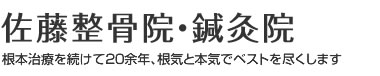 佐藤整骨院とは…ミッション高い治療効果をあげるためには、より高い治療技術の習得に励まなければならない。 治療方針患者様に現状がどうなっているか、今後の見通しをよく説明し、理解していただくことを第一に考えています。 突発的に発生する骨折、捻挫、脱臼、打撲、挫傷(肉ばなれ)などの外傷に対しては、まず重症度の鑑別をして、的確な初期治療の選択・処置によって苦痛を軽減し、回復を早めます。 日常生活の中で起きる腰痛をはじめ、頚、肩、膝、股関節などの痛みや症状は身体の関節の動きの異常が原因で起こります。 鍼灸の治療も慢性期の頑固な痛みには効果を発揮することが多く、有効な治療法です。